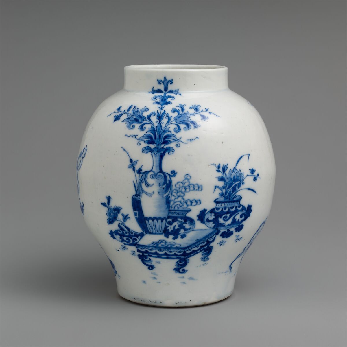 The Saint-Cloud factory was the first to produce soft-paste porcelain in France on a commercial basis. Established to make faience, or tin- glazed earthenware, the factory experimented with formulas for soft- paste porcelain that was in production by the early 1690s.[1] This vase appears to be one of the earliest works produced at Saint-Cloud, and it belongs to a small group of objects made in the years between 1695 and 1710, which, in the absence of any factory marks, can only be attributed to Saint-Cloud, a factory still in its first period of porcelain manufacturing.[2] A number of these works now believed to have been made at Saint-Cloud were attributed previously to the Poterat factory of Rouen (see 50.211.186),[3] but based on qualities of paste and glaze, as well as stylistic considerations, a Saint-Cloud origin is more persuasive. Nonetheless, the slightly pinkish aspect of the glaze of the present example distinguishes it from the more typical cool, slightly bluish cast of most early Saint-Cloud porcelain, serving as a reminder that attributions are challenging for objects made by small enterprises in their first years of production, especially in a nascent industry, such as porcelain manufacturing at the end of the seventeenth century.