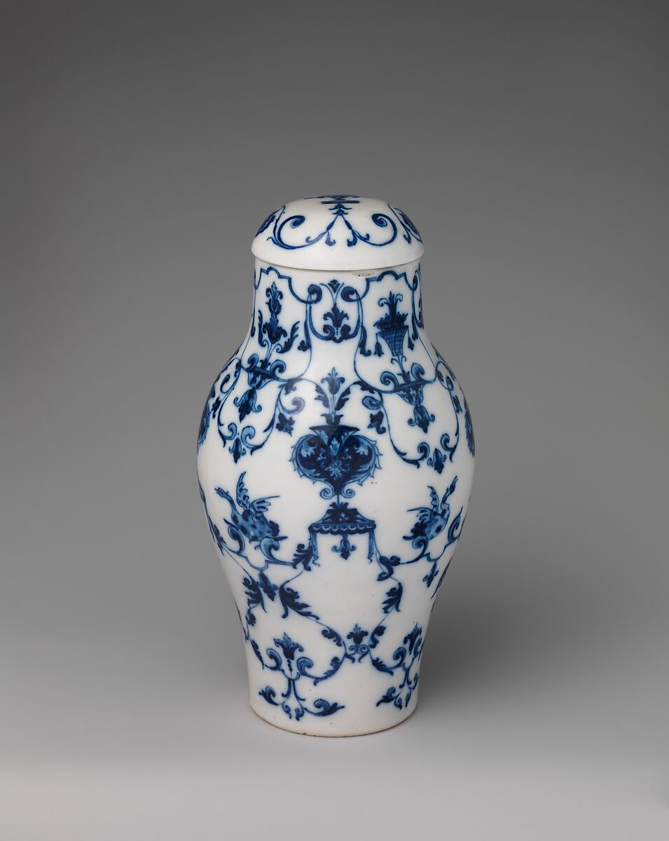 Of Chinese inspiration, both in its form and blue-and-white color scheme, the jar is painted in a manner that combines Renaissance grotesque elements based on etchings by Jacques Androuet du Cerceau (ca. 1510/20–1585/6) with the contemporary designs by Jean Berain (1637–1711).