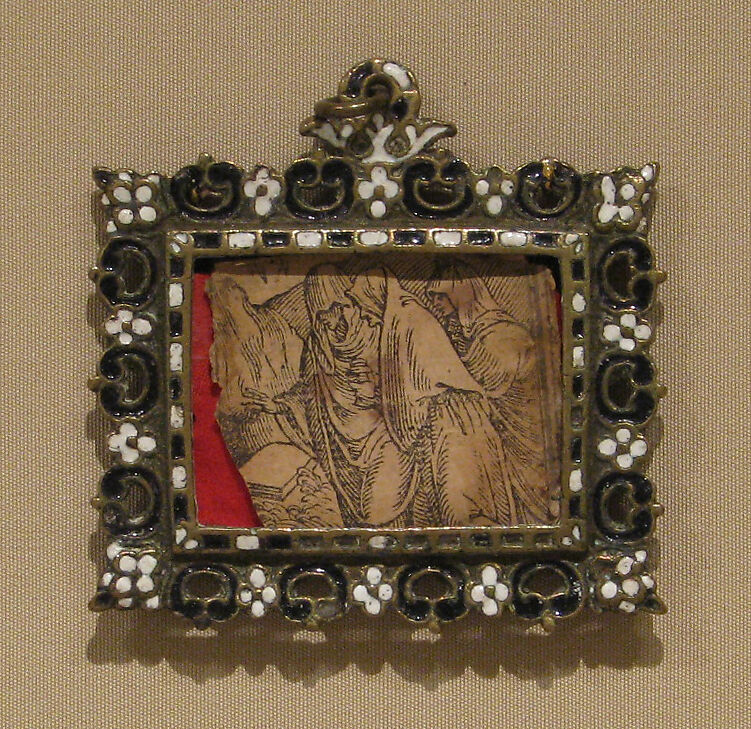 Although such framelike insignia were made in gold for the wealthier members of Marian confraternities, this one, of brass like the pair alongside it, must have belonged to a less properous adherent. Bearing the cipher of the Virgin on its front, behind the glass it still contains a fragementary engraving of the three Marys at the tomb.