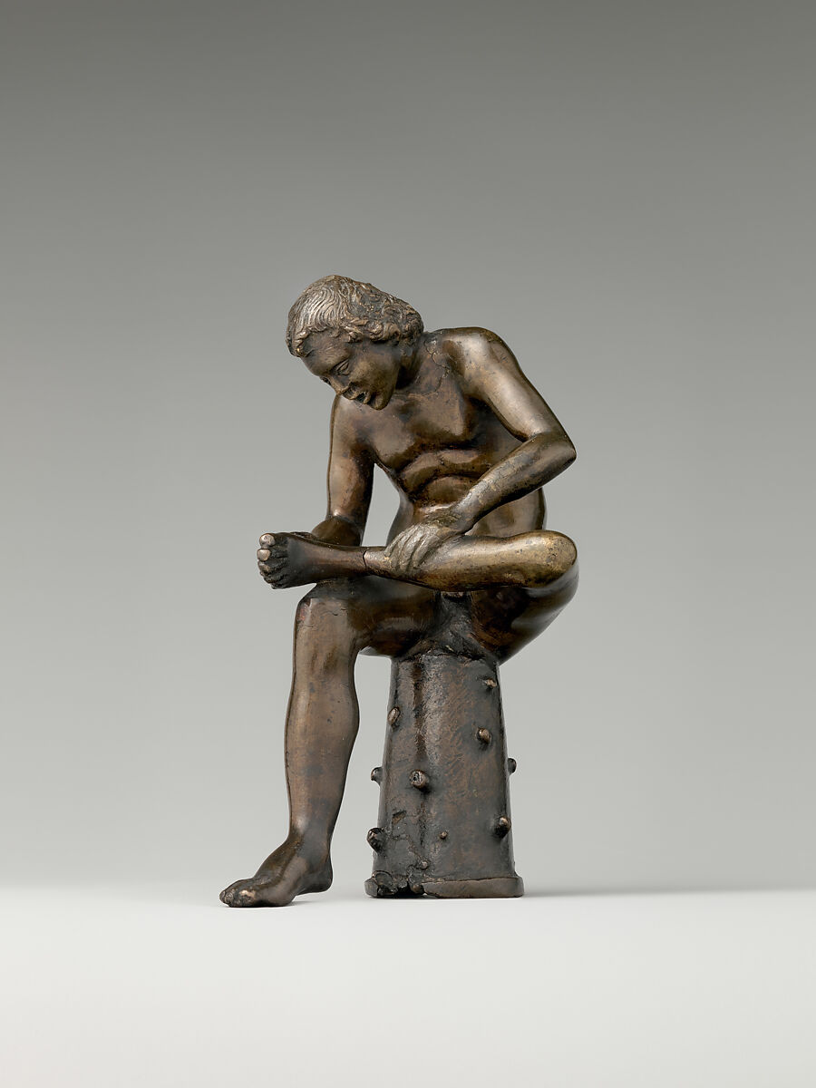 The two sculptures are miniatures of the renowned Spinario now in the Musei Capitolini in Rome, an ancient bronze that depicts a boy pulling a thorn from his left foot (p. 00, fig. 9a). Our bronzes reproduce its overall design while taking numerous liberties with the figure’s anatomy and physiognomy. Of the seven bronze statuettes representing the same subject in The Met’s collection, these two share an indisputable likeness in the rendering of the musculature and the somewhat caricatural appearance of the faces. The bronzes also exhibit a similar treatment of the hair—brushed forward around the forehead and temples, rippling in generous curls above the shoulders—and a common support in the form of a stylized tree stump, which, in its dry naturalism, recalls the rocky base of the antique model. The ancient Spinario was much studied in the medieval and Renaissance eras, when it was on constant public display (see cat. 39).