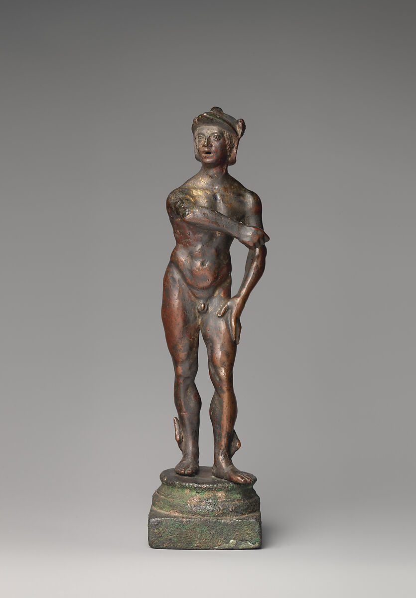 Mercury, with open mouth and fairly expansive gesture (his left hand once held a caduceus), appears in his role as god of eloquence. A more energetic variation of the model has bulging thighs.[1] Squarish plugs, characteristic of Severo’s workshop, are above the buttocks. The statuette was later mounted by two screws to a waisted bronze socle with a beaded molding, and a green patina of uncertain date was probably supplied to make the piece look “Roman.”