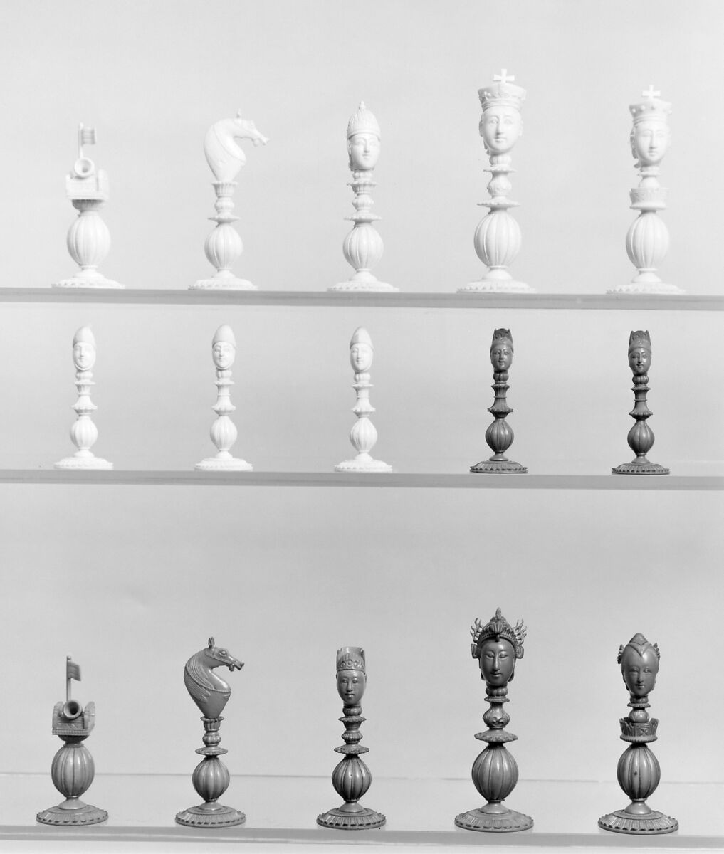 The European king and queen, possibly Carlos I of Portugal and Queen Marie Amélie, are represented by crowned heads, the bishop by an episcopal head wearing an orientalized miter. Their opponents are Chinese, the king with an elegantly fretted headdress. Both knights are horse heads of a type common in European chess sets of the eighteenth and nineteenth centuries. An echo of Chinese chess, which has pieces named cannons, is in the mortars surmounted by flags for the rooks. The pawns are heads of Europeans or Chinese on baluster stands. The type of chessmen composed of balusters surmounted by human heads appears also in Bosnia-Herzegovina in the nineteenth century (Wichmann, Chess, pl. 156). Pieces of this type are practical for play. The theme is obviously Europeans and Chinese; the combination of Occidental and Oriental features has been satisfactorily accomplished.