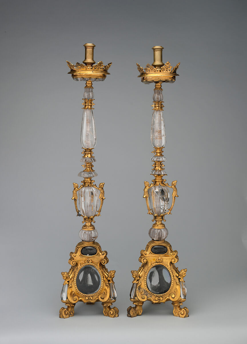 Like our other candlesticks (cat. 162), this monumental pair was destined for a church altar. Although identical in technique, the two sets differ in structure and design, particularly the style of the volutes and the modeling of decorative elements such as the cherubs. The volutes and the figures’ thick, clustered curls are reminiscent of Neapolitan Baroque metalwork produced between 1620 and 1640. Many goldsmiths and metalworkers were operating in Naples during that time, producing opulent pieces for churches, monasteries, and convents.[1] The majority of these works are known only through documents, although some noteworthy examples have recently been traced and published in Spain.[2] During their Italian tenure, many Spanish viceroys commissioned works of art in Rome and Naples that were destined for churches or palaces back home. This pair of candlesticks may have been one such export.