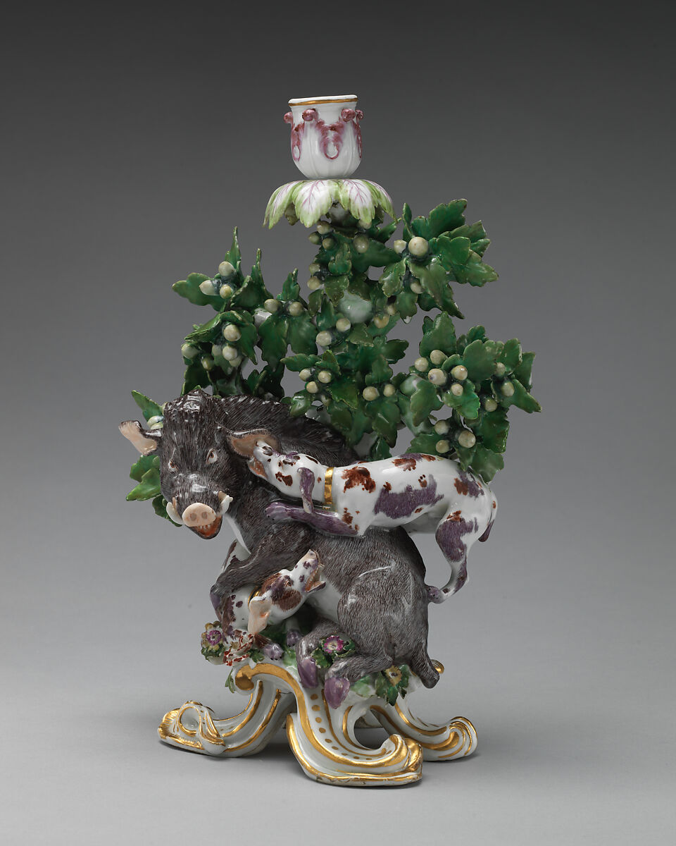 The subject, a boar attacked by two hounds, probably came from a French or German source, as the wild boar was extinct in England long before the eighteenth century.