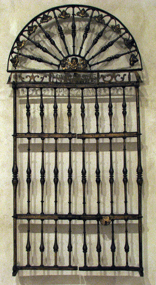 The Severe, or Philip II, style is reflected in the design of this grille, which relies on the repetition of spindles of highly sophisticated proportions for its decorative effect. The gold leaf was applied in a thin layer, leaving visible the texture of the wrought iron.