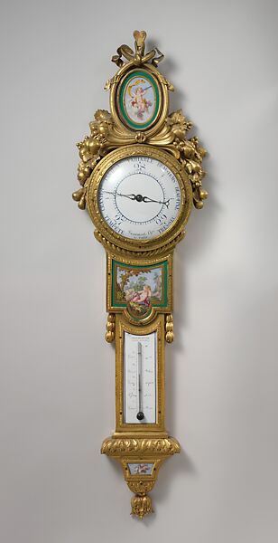 The scenes displayed on the Sèvres porcelain plaques of this instrument were inspired by a rare astronomical event that occurred twice during the eighteenth century. The second transit of the planet Venus across the sun took place on June 3, 1769, and was observed by the French court from the terraces of the Château de Saint-Hubert. Louis XV himself explained the phenomenon to Madame du Barry, lending her his telescope. This public display of favor did not go unnoticed and was quickly immortalized in a popular poem. Later that same year, on December 20, 1769, Madame du Barry acquired from the dealer Simon-Philippe Poirier a barometer and thermometer made by Claude-Siméon Passemant, engineer to the king. Mounted with Sèvres porcelain and gilt bronze, that piece is believed to be the one in the Museum’s collection. Not only is the porcelain marked on the back with the date letter Q, for 1769, but also one of the plaques is inscribed “Passage de Venus sur le disque du [soleil ] Juin 1769.”