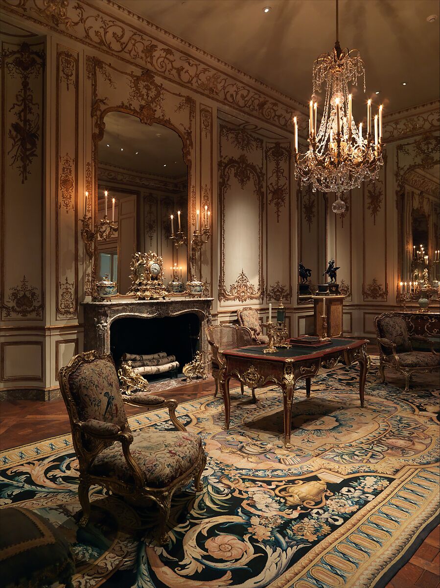내장재나 나무 패널에 새겨진 멋진 새긴 무늬는 부분적으로 고부조를 한 것으로, 이 방에서 가장 아름다운 것이라 여겨집니다. 내장재나 나무 패널은 원래 18세기 파리의 사택 중 하나인 바랑주빌 호텔에 있었으며, 바랑주빌 호텔은 비록 많이 개조되었지만 여전히 생제르맹 217번가에 있습니다.채색되고 도금된 참나무 판자가 C 스크롤, S 스크롤, 꽃의 잔가지, 로카유 주제로 화려하게 장식되어 있으나 그 장식은 아직도 주로 대칭적이기 때문에 완전한 로코코 스타일을 대표하지는 않습니다. 트로피는 음악, 원예, 군사적 명예, 고귀한 영광과 같은 개념 및 특성을 암시하며 거울과 벽 칸막이의 두루마리 테두리에 앉아 있는 목이 긴 새들은 이국풍에 대한 당대의 관심을 반영합니다.