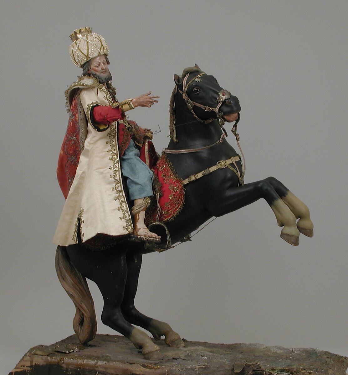 In 1964, Loretta Hines Howard generously presented to the Museum over 140 Neapolitan crèche figures, dating from the second half of the eighteenth century. The varied assortment includes figures from the three traditional scenes of a complete Neapolitan presepio: the Nativity, with angels, shepherds, and sheep; the procession of the three Magi, with their colorful retinue of attendants; and the varied and gay crowd of country and town people thronging the tavern, or inn, of Bethlehem — the diversorium mentioned by St. Luke, where on the Holy Night there was no place for Mary and Joseph. Averaging between twelve and fifteen inches in height, according to the position they were to take in perspective in the stage set, the figures are pliable and can be given poses at will, according to their facial expressions. Their bodies are made of tow and wire, their arms and legs are finely carved of wood, and their heads and shoulders are modeled of terracotta and accurately finished. Their attire, often enriched by accessories, jewels, and embroideries, is a sheer joy for the lover of folklore and eighteenth-century costumes.