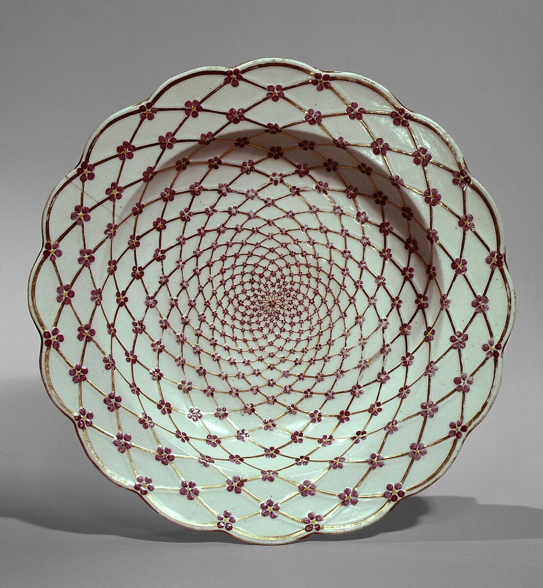 The Imperial Porcelain Factory was established in 1744 by the Empress Elizabeth I (r. 1741–61). For several years production was hampered by unreliable or inexperienced workmen, but by the 1750s the factory had begun producing porcelain in the Meissen style. This plate is from the factory's first table service, made for the empress about 1756–60. Every piece was decorated with a graceful molded trellis pattern, which suggests they were part of a dessert service, perhaps to be used in summer.