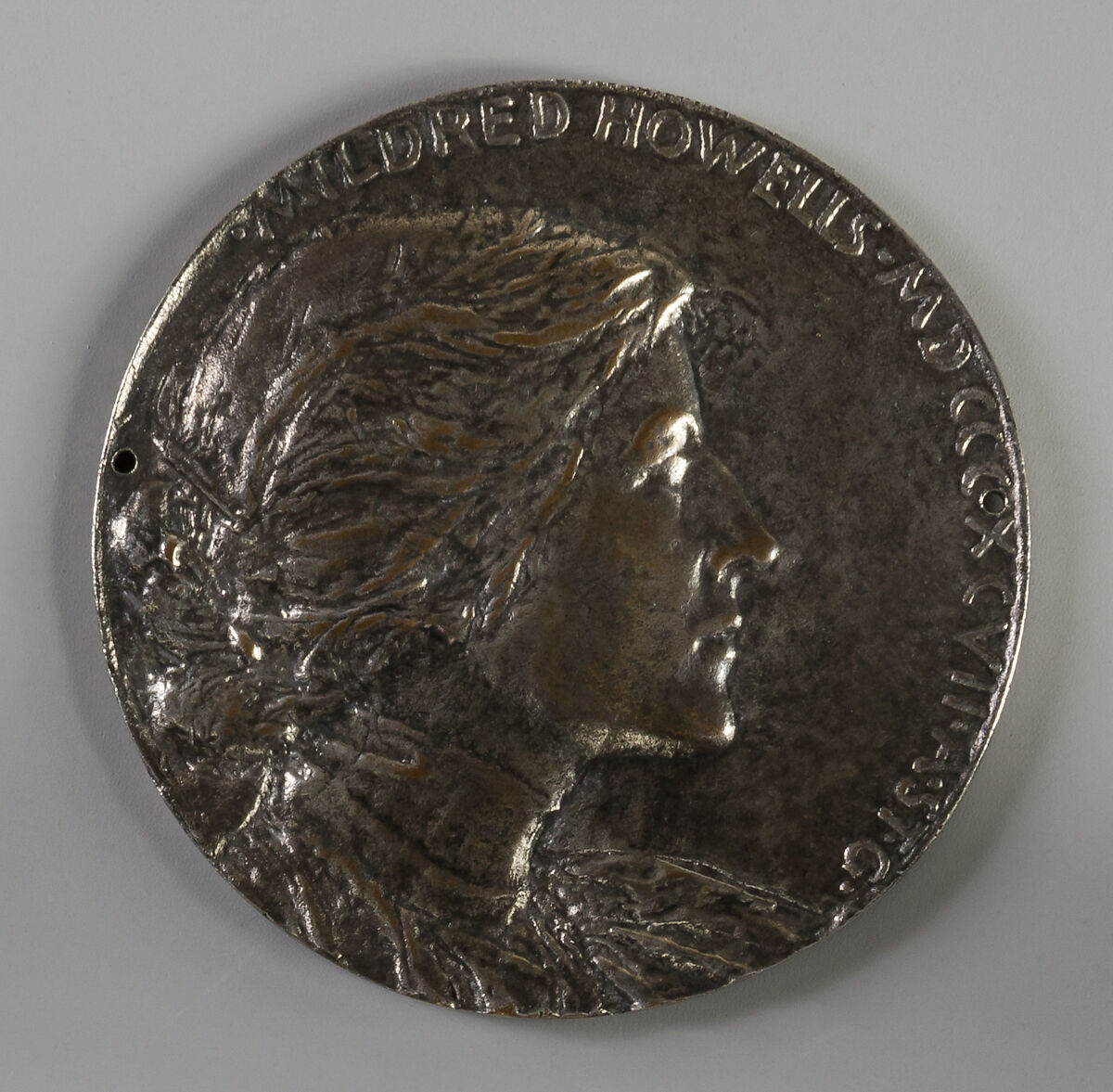 This medal of poet and artist Mildred Howells (1873-1966) was excerpted from Saint-Gaudens’s rectangular low-relief portrait of the sitter posed alongside her father, writer William Dean Howells. The reduced circular shape illustrates Saint-Gaudens’s mastery of compositional design, as the simple lines of Howells’s right-facing profile are enlivened by the bold twists and delicate wisps of her low-swept bun.
