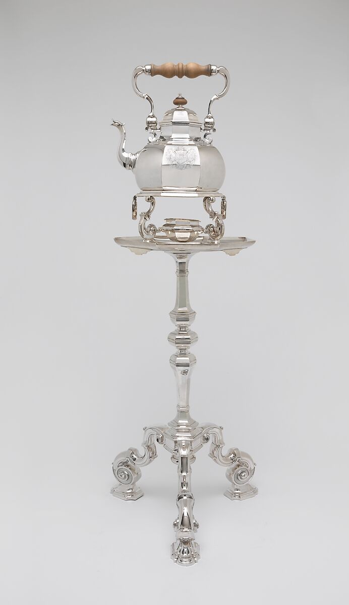이 기념비적인 주전자와 스탠드는 스트레텀 성의 조지 보우즈와 아주 부유한 상속녀 엘리너 버니의 1724년도 결혼을 기념하기 위해 만들어졌을 가능성이 높습니다. 탁자의 대담하고 파동치는 받침대를 견고한 은으로 입힌 것을 보면 값 비싼 선물이었을 것입니다. 그 시대 대부분의 은 가구는 금속의 가치를 복구시키기 위해 녹여졌기 때문에 이것은 진귀한 잔존물입니다. 이 작품은 우아한 바로크 윤곽, 정밀한 주조 및 세밀한 제판술이 두드러집니다. 은세공인 시몬 판틴은 런던에서 일하던 프랑스