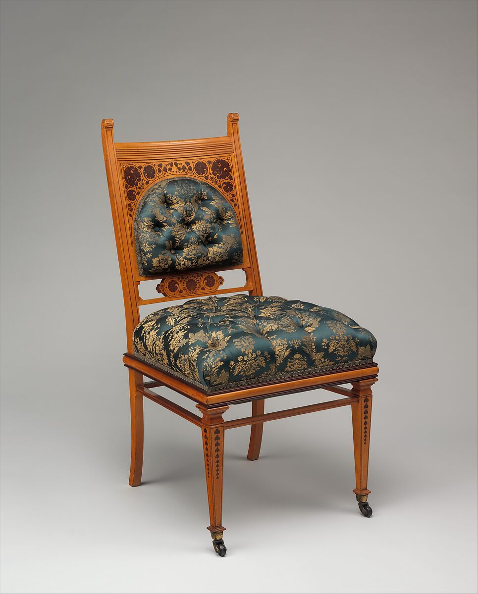 This side chair of satinwood and purpleheart, one of a pair, is part of the suite (2009.226.1–.4) that furnished Worsham’s elaborately decorated dressing room, one of the preserved interiors now installed in The American Wing (Gallery 742). These objects were part of a decorative program that encompassed every aspect of the room, including the architectural woodwork, lighting, stenciled wall-treatment, painted ceiling and frieze, textiles, and other furnishings. On the chair’s back, the marquetry decoration of grotesque masks and vines echoes the ornamental motifs in the dressing room’s architectural woodwork. The overall form is light and rectilinear. The tapered front legs with cascading bellflowers channel the spirit of English Neoclassical designers such as Robert Adam and George Hepplewhite. It rests on castors, allowing it to be moved easily within the room.