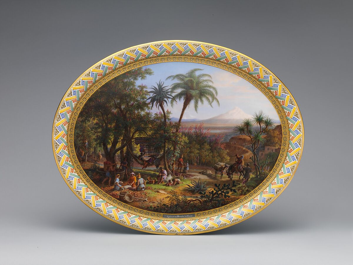 The best of the Sèvres porcelain produced in the mid-nineteenth century displays an originality of conception unmatched by the other European ceramic manufactories of the period. This inventiveness is reflected in the unusual subject matter and bold ornamental patterns employed in the decoration of this service. Each of the scenes depicts an aspect of the cultivation of cacao or the preparation of hot chocolate, and the various stages of production and the utensils employed are rendered with a surprising degree of historical accuracy. The scenes were both conceived and painted by Jean-Charles Develly, one of the most prolific and creative artists at the Sèvres factory. A different hand was responsible for the colorful borders and motifs that, though entirely fanciful, were intended to evoke ancient Aztec designs. This coffee service was purchased in 1986, when the collecting of nineteenth-century Sèvres porcelain by American museums was uncommon, and it remains one of the cornerstones of the Museum's nineteenth-century ceramic holdings.