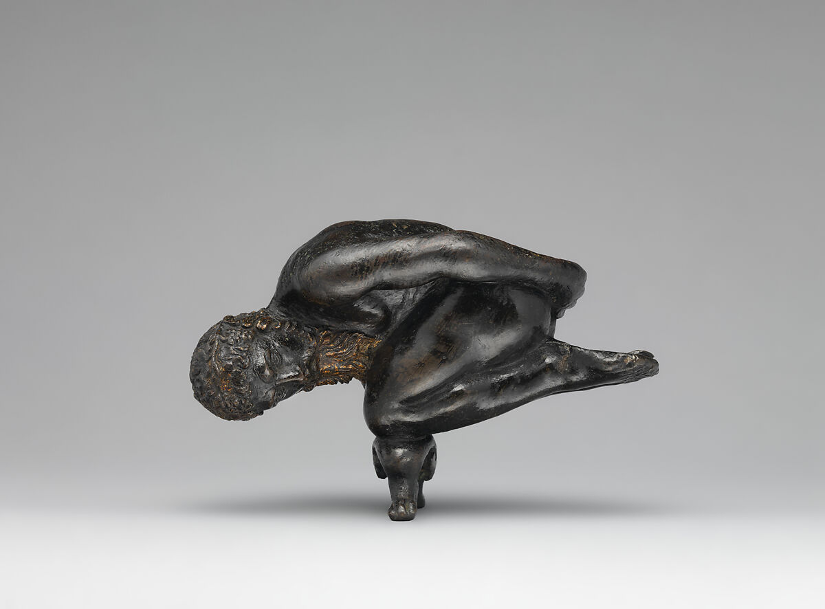 Small desk lamps of this type, in which the figure on top would seem, naughtily, to blow flames from his backside when the wick was lit, were fairly common in Renaissance households, to judge by the large numbers that survive. The earliest published examples of our model were considered ancient. That in Bologna’s Museo Civico Archeologico was engraved when it belonged to the Bolognese nobleman Ferdinando Cospi in 1677.[1] Another, in the Louvre, inventoried in 1684, was called a “très bel antique romain.”[2] A third was illustrated in 1722 when owned by Dom Emmanuel Martí, an antiquarian of Alicante.[3] The closest in composition to The Met’s, in the Museo Nazionale del Palazzo di Venezia, Rome, has an almost identical foliate stem flanked by animals’ paws, but its hair and beard are rendered somewhat more crudely.[4] The stem served to insert the figure into its base, which, as in some of the lamps, may have taken the form of a raptor’s talons. The well-formed chased and gilt hair, crown of grapes and leaves, and beard distinguish the present bronze from all others, which since the early twentieth century have been assigned generically to Riccio.[5] Wolfram Koeppe proposed an attribution to Agostino Zoppo on the basis of the river gods in the monument to Livy in Padua (p. 00, fig. 32a),6 but Zoppo’s beards are curlier, not straight and stringy like our athlete’s.
