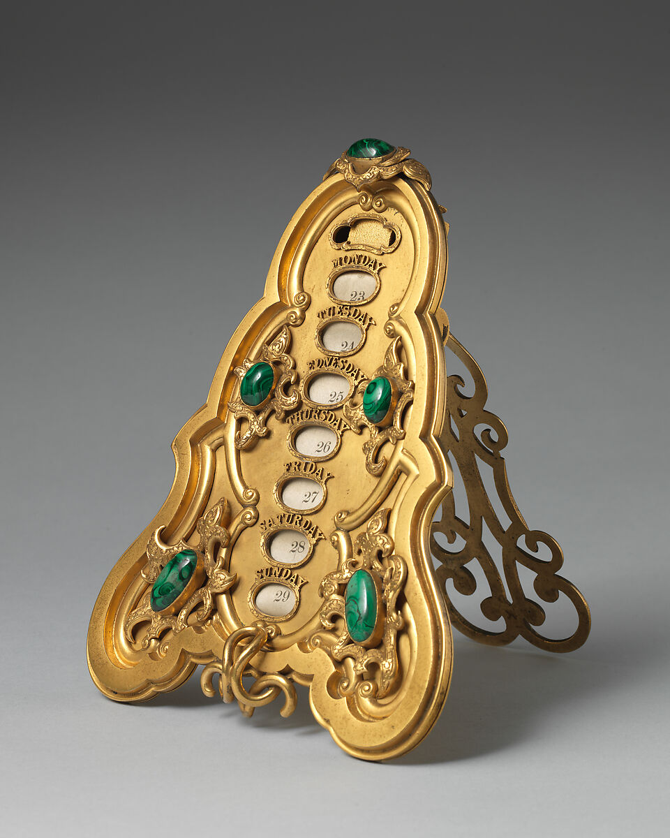 The set (1982.88.1–.8) was shown at the Crystal Palace exhibition in 1851. Except for the paper knife, each piece is engraved underneath with Asprey's name and address and the words Exhibition 1851.