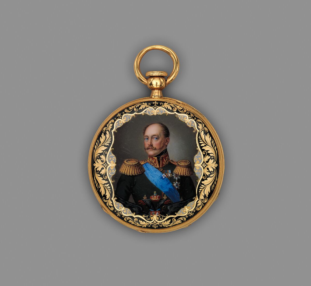 It has usually been assumed that the watches with portraits of kings and those of high status in their courts were given as rewards for loyalty or service. This was not invariably the case, however, for the watch with Hesselin’s likeness, for example, is known to have been in his own possession at the time of his death.[6] Still, it is probable that most such timepieces were, indeed, more commonly commissioned as tokens of princely, royal, or imperial favor. This watch in the Museum’s collection with a portrait of Czar Nicholas I of Russia (1796–1855) on the back of the case surely belongs to the tradition of gifts or awards. Providing additional evidence, at least one other with the identical portrait survives most probably in Russia.[7]