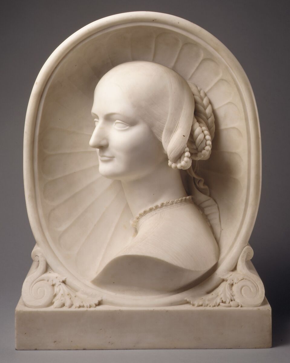 Triqueti was one of the most sophisticated sculptors of his dat. He knew the Elgin marbles, collected Géricault, and catalogued Bonington. His early grounding in ornamental sculpture is still manifest in this work from the middle of his career, as is his talent for portraiture-comparisons with the swannecked beauties of Ingres come readily to mind. Triqueti received several coveted commissions: the bronze doors of the Madeleine in Paris, completed in 1837; the marble effigy of the widely lamented duc d'Orleans at Neuilly, completed in 1843; and the marble cenotaph of Prince Albert in the Wolsey Chapel at Windsor, begun in 1864. The subject of the relief may be his wife, an Englishwoman whom he wed in 1847. He reinvented this type of portrait medallion, the imago clipeata, from Greco-Roman antiquity while giving it his own abstract interplay of concaves and convexes. The type enjoyed a healthy afterlife in the portraiture of the British sculptor Alexander Munro. The signature and date of 1805 under the shoulder are in a later hand.