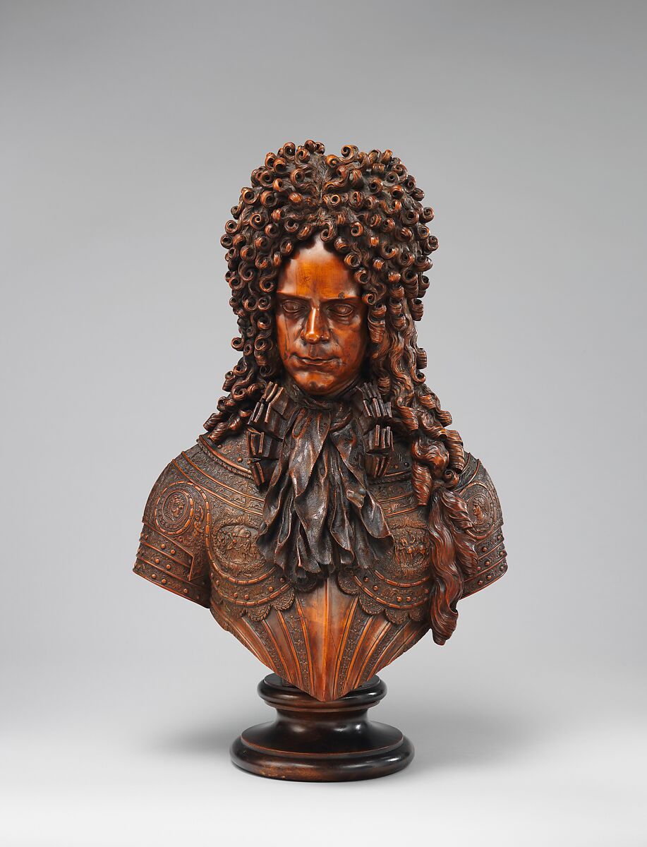 Finely detailed armor, a fluttering jabot, and an extravagantly combed wig set off the smoothly burnished face of the military commander portrayed in this wooden bust. His direct gaze is emphasized by the scooped truncation of his cuirass, which slices aggressively forward beneath it. The head turns slightly, against the flow of the lace cravat, imparting a sense of movement. Beneath the soft elements of lace and hair, sharply engraved images appear on the breastplate. The enwreathed ovals have been identified as scenes of Alexander the Great and his close friend Hephaestion at the tent of King Darius (to the viewer’s left) and the Justice of Trajan (slightly obscured, to the viewer’s right). Medallions on the pauldrons of Alexander the Great (left) and of the emperor Trajan (right) repeat the principal military figures seen in the ovals. Livia Drusilla, wife of Augustus Caesar (erroneously paired with Alexander), and Plotina, Trajan’s wife, occupy the pauldrons on the back of the cuirass.