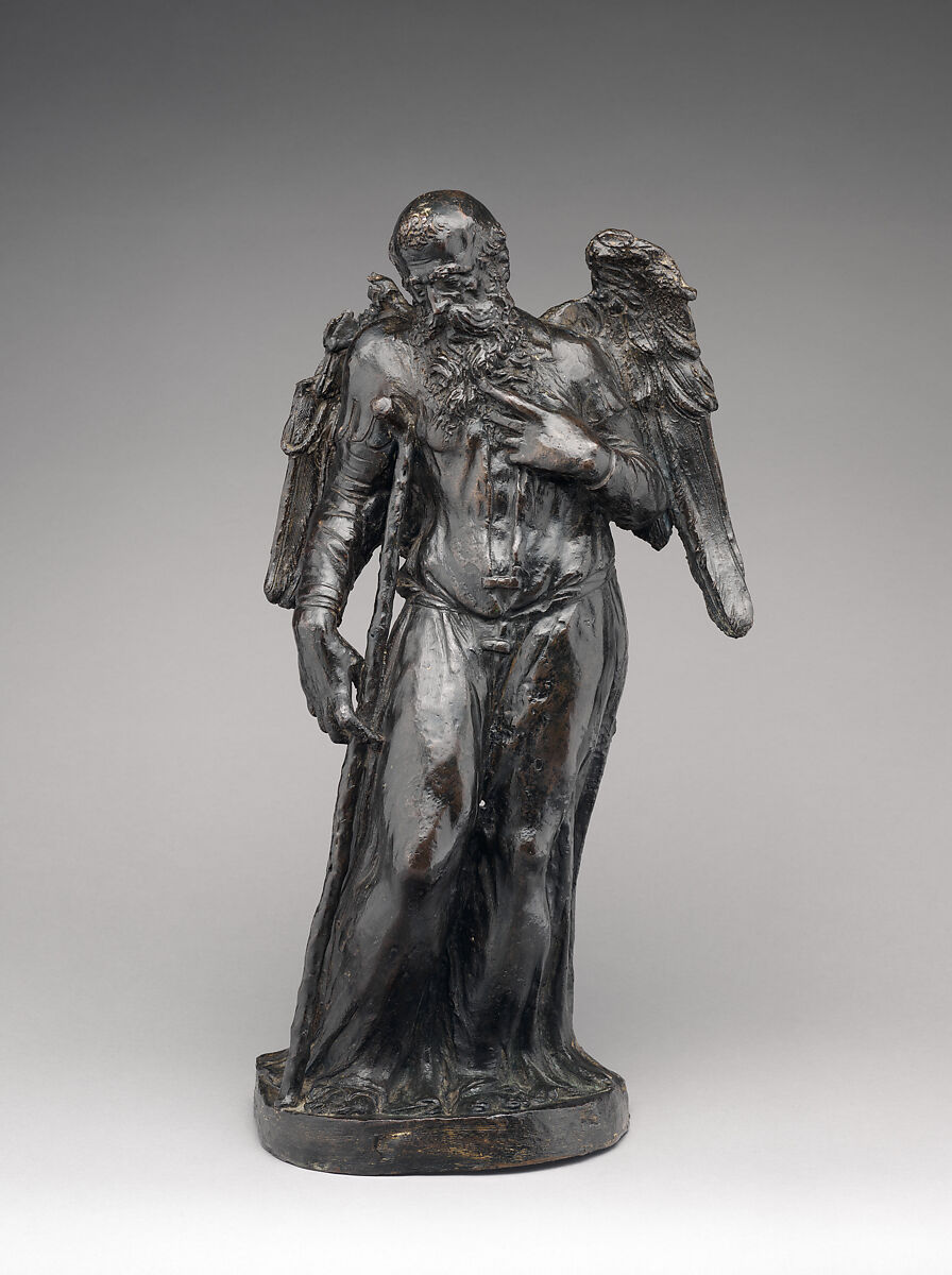 The open backs of the two statuettes bear the remains of plaster that helped secure them, probably in niches. The figural style is identical to that of niched figures on the tomb of Tito Livio in the Palazzo della Ragione, Padua, of 1547.