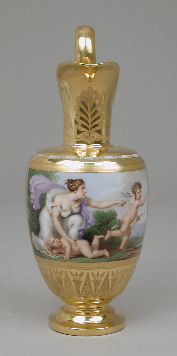 This breakfast service (56.29.1–.8) was presented by Napoleon I to Princess Auguste-Amélie, wife of his stepson Eugène Beauharnais, on New Year's Day of 1814. The overall theme of the decoration was described in the factory records as the "loves of amors and nymphs," and the title given to the scene on the tray was "Accused Nymphs Appearing before the Tribunal of Love."