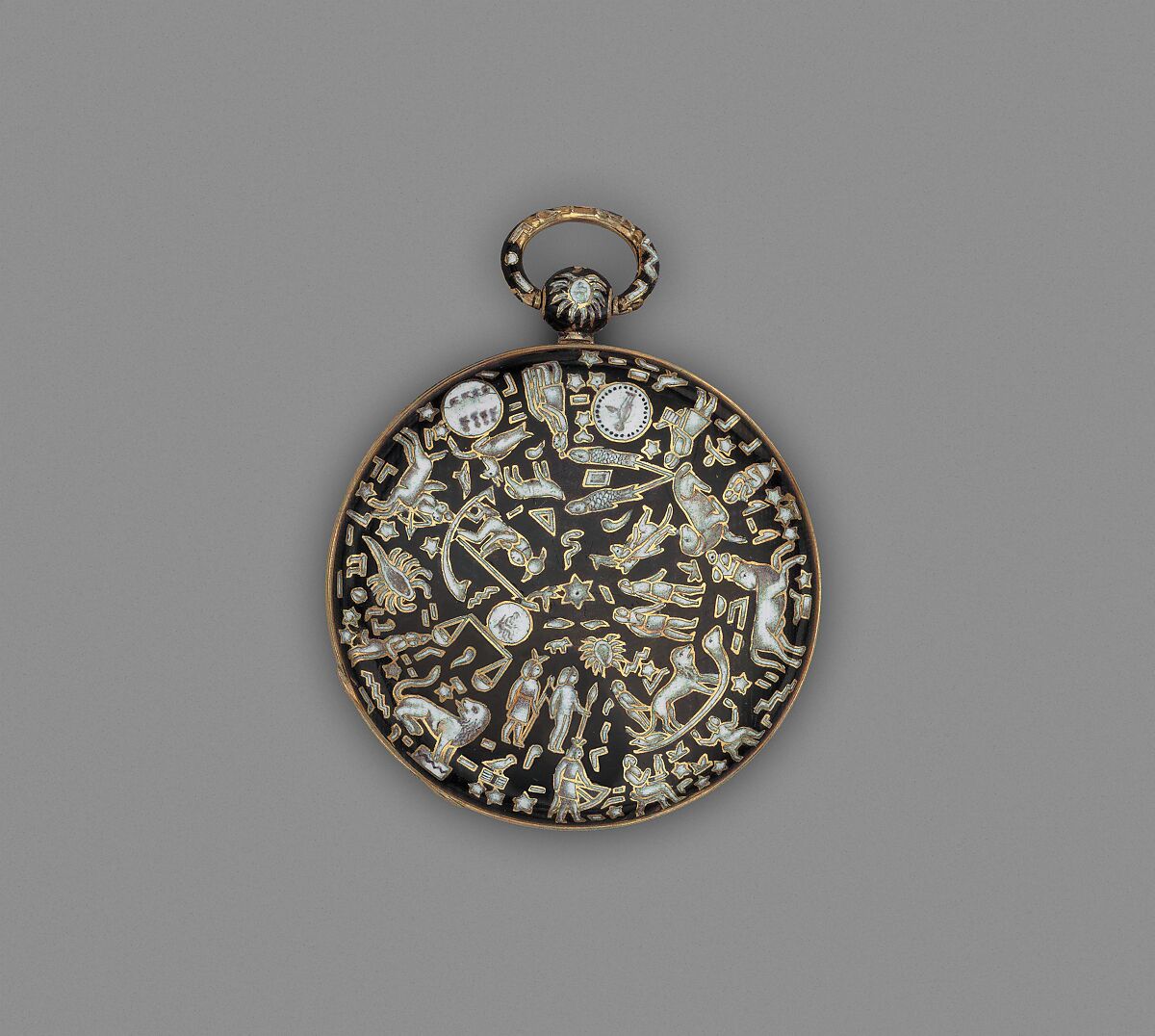 This pocket watch belongs to a category of upscale souvenir watches. It features Egyptian zodiac symbols taken from a Ptolemaic sandstone bas-relief that was brought to France in 1821 from the Temple of Hathor in Dendera, Egypt