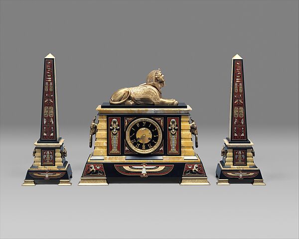 Tiffany & Co. marketed this ormolu and marble mantel set in about 1885. The set, consisting of a clock and a pair of decorative obelisks, represents a popular rather than an archaeological idea of Egyptian art: the hieroglyphs on the obelisks and on the sphinxes of the clock would not bear the scrutiny of an Egyptologist.
