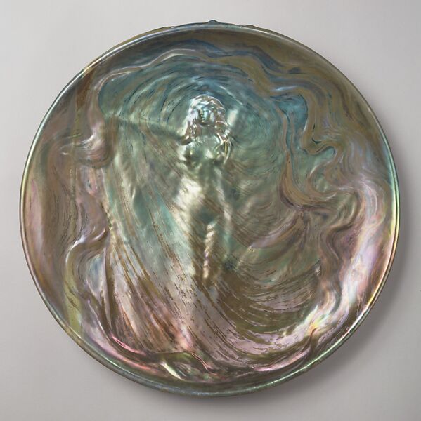 It has been suggested that the female figure on this large plate depicts Loie Fuller, the celebrated American dancer who achieved fame in Paris at the end of the nineteenth century. The low-relief modeling of the figure and the shimmering iridescence of the luster glaze effectively suggest Fuller's well-known "Fire Dance", in which swirling drapery and colored lights were the only props.
