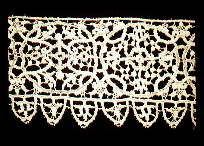Punto in aria—literally, "stitches in the air"—is one of the earliest styles of needle lace, which is itself developed from cutwork of primarily geometric design. When lacemakers transitioned to using a foundation of threads laid out according to a pattern drawn on parchment, they were able to incorporate more fluid lines and curves into their designs.