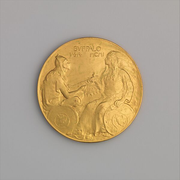 MacNeil, an accomplished medallist, designed this award medal for the Pan-American Exposition, a world's fair held in Buffalo, New York, in 1901. Manufactured by Gorham, this medal demonstrates MacNeil’s ongoing interest in Native American subjects. The obverse features Liberty walking alongside a bison; the reverse depicts two Indigenous men, one representing South America (at left, cross legged) and the other depicting North America (at right, seated) sharing a peace pipe to symbolize Pan-American friendship.