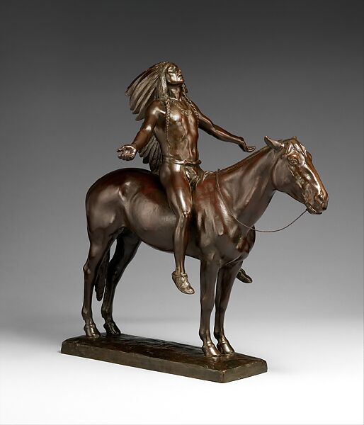 Appeal to the Great Spirit presents a Native man on horseback wearing a feathered headdress, his head raised and arms outspread in communion with a divine power. More than four hundred authorized bronze statuettes were cast in three different sizes, of which this is the middle one—testament to the popularity of sculptures depicting prevailing Euro-American visions of a "vanishing race." Today, such works represent the complicated, painful legacies surrounding falsehoods about the decline and erasure of Indigenous peoples.
