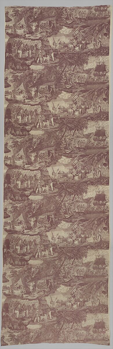 Frederic Feldtrappe produced this textile in the early nineteenth century during a moment of intense debate in France over the viability and morality of the slave trade. Of the four narrative scenes, two reference earlier paintings by English artist George Moreland and contrast the brutality of European slave traders with the kindness of Africans who minister to a shipwrecked European family. The other two scenes, based on engravings by Frenchman Nicolas Colibert, juxtapose a happy African family with the appearance of European traders in Africa. Their cache of trade goods (including textiles) ominously foreshadows the horrors of the traffic in human beings.