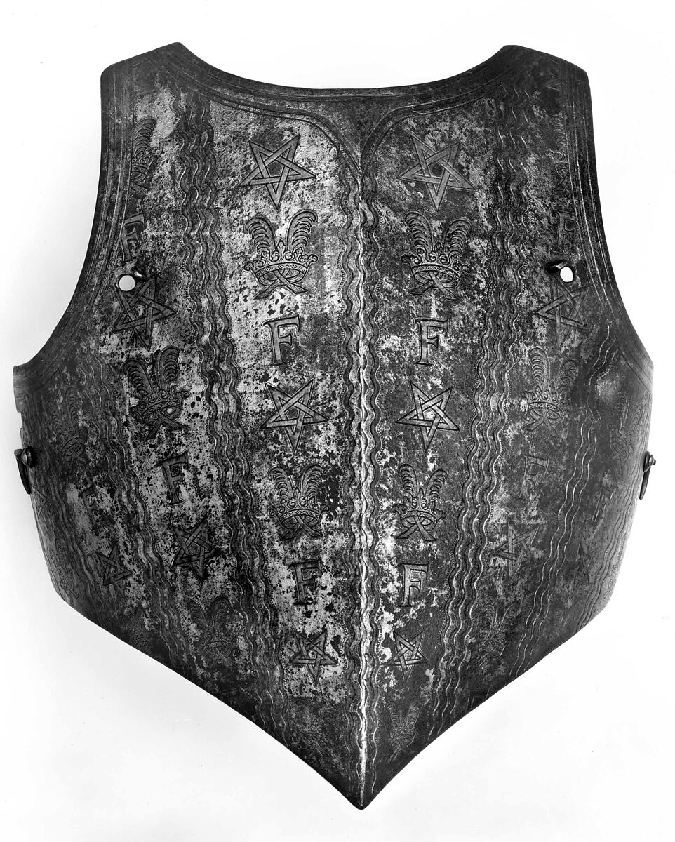 The symbols deeply engraved on the silvered steel surface of this breastplate and on the barrel and lockplate of the associated pistol include a pentagram, the letter F, and a coronet encircling a pair of crossed palm branches. These are the personal emblems of the Spanish nobleman Don Gómez Suárez de Figueroa Y Córdova, duke of Feria (1587–1634), a prominent military commander in the service of King Philip III. From 1618 to 1625 and again from 1631 to 1633, he held the prestigious post of governor of the duchy of Milan, then a Spanish territory. It was probably during this period that the duke of Feria commissioned this pistol (one of a pair) and the armor, now in the Royal Armory in Turin, Italy, to which this reinforcing breastplate originally belonged.
