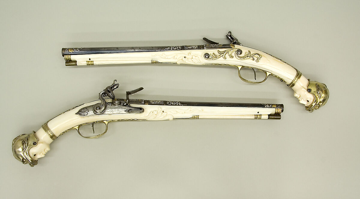Although Dutch in overall style, these pistols are unusual because they were made in Aachen rather than Maastricht and because the helmets on the pistol butts are separately made in gilt silver rather than carved in ivory.