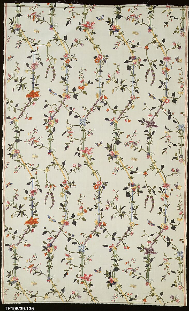 The wealthy throughout Europe adored Chinese silks, which were exported in massive numbers by the Spanish, the Portuguese and the British. Finely woven, and delicately painted by hand with exquisite floral motifs, designed to resonate with European taste, this type of patterning was described as “sprigged” in trade records. Glossy taffetas like this were used in Europe as dress fabric and as wall hangings.