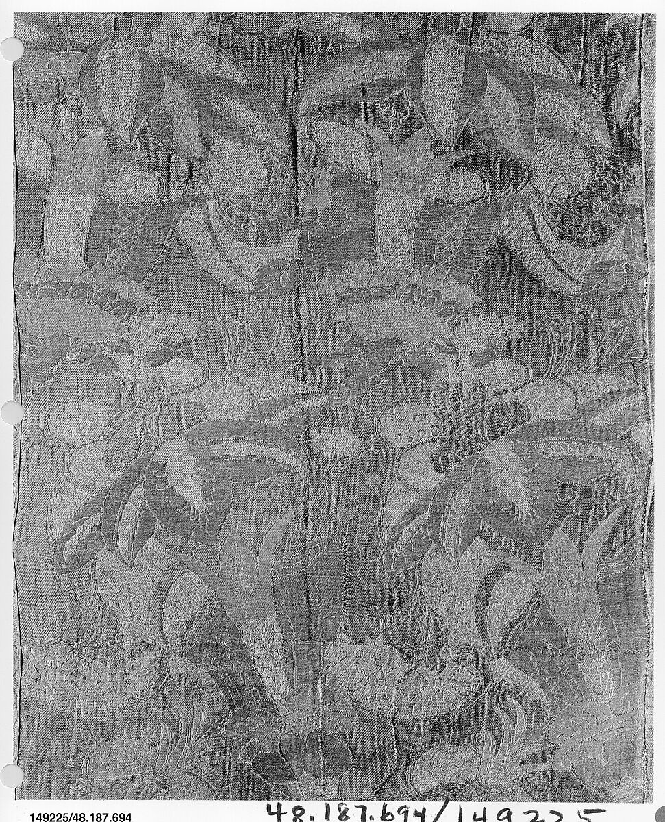 Panels such as this—with its extraordinary patterns in long repeats—were called "bizarre" by the Danish scholar Slomann, who believed they were made in India. Most scholars consider them an exotic phase in the history of European silk weaving.