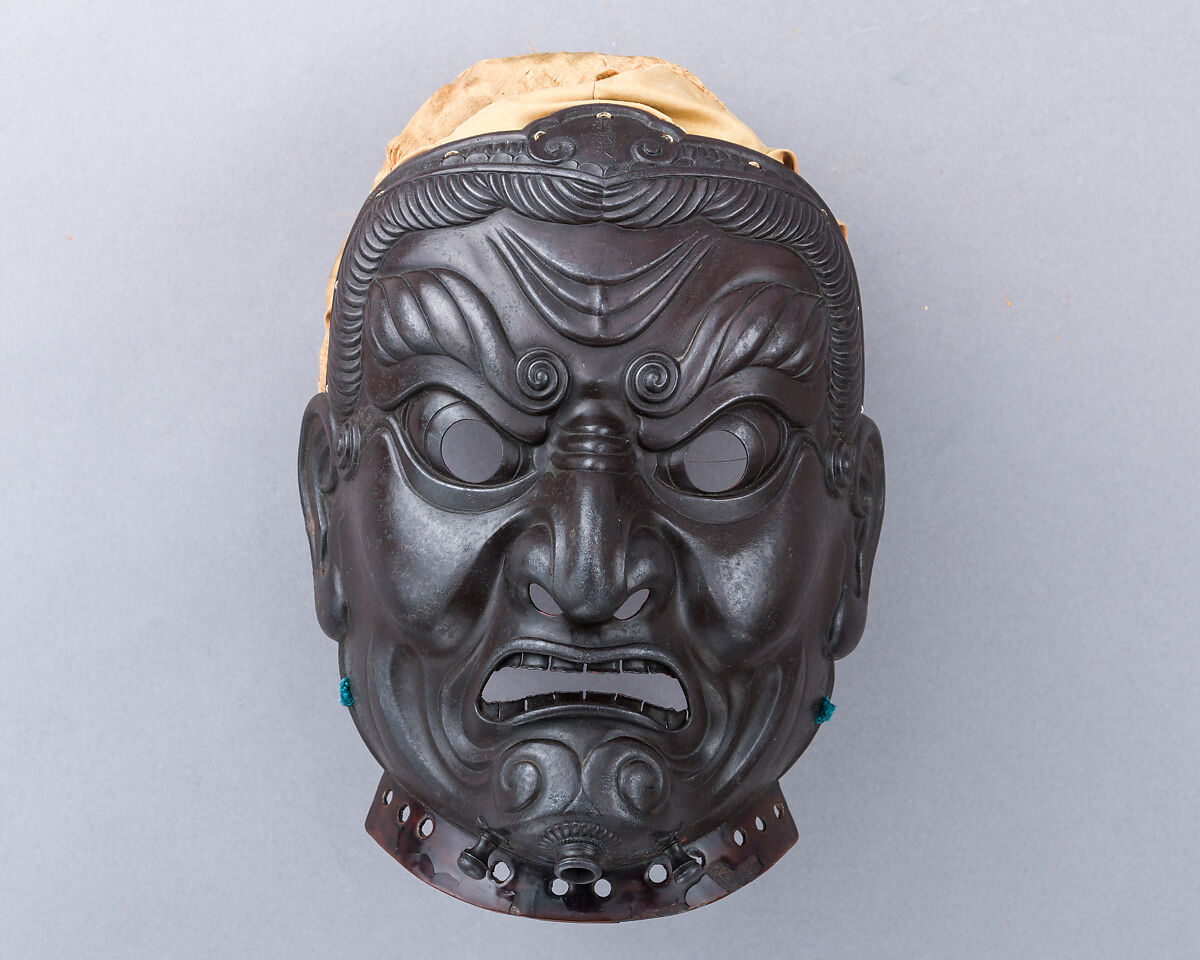 Muneakira's masterpiece, this mask by Muneakira was already famous when it was first published in 1763. It represents Jikokuten, guardian of the East, one of the Four Kings of Heaven. The mask is also one of the few to retain its original silk head covering sewn to the upper edges.