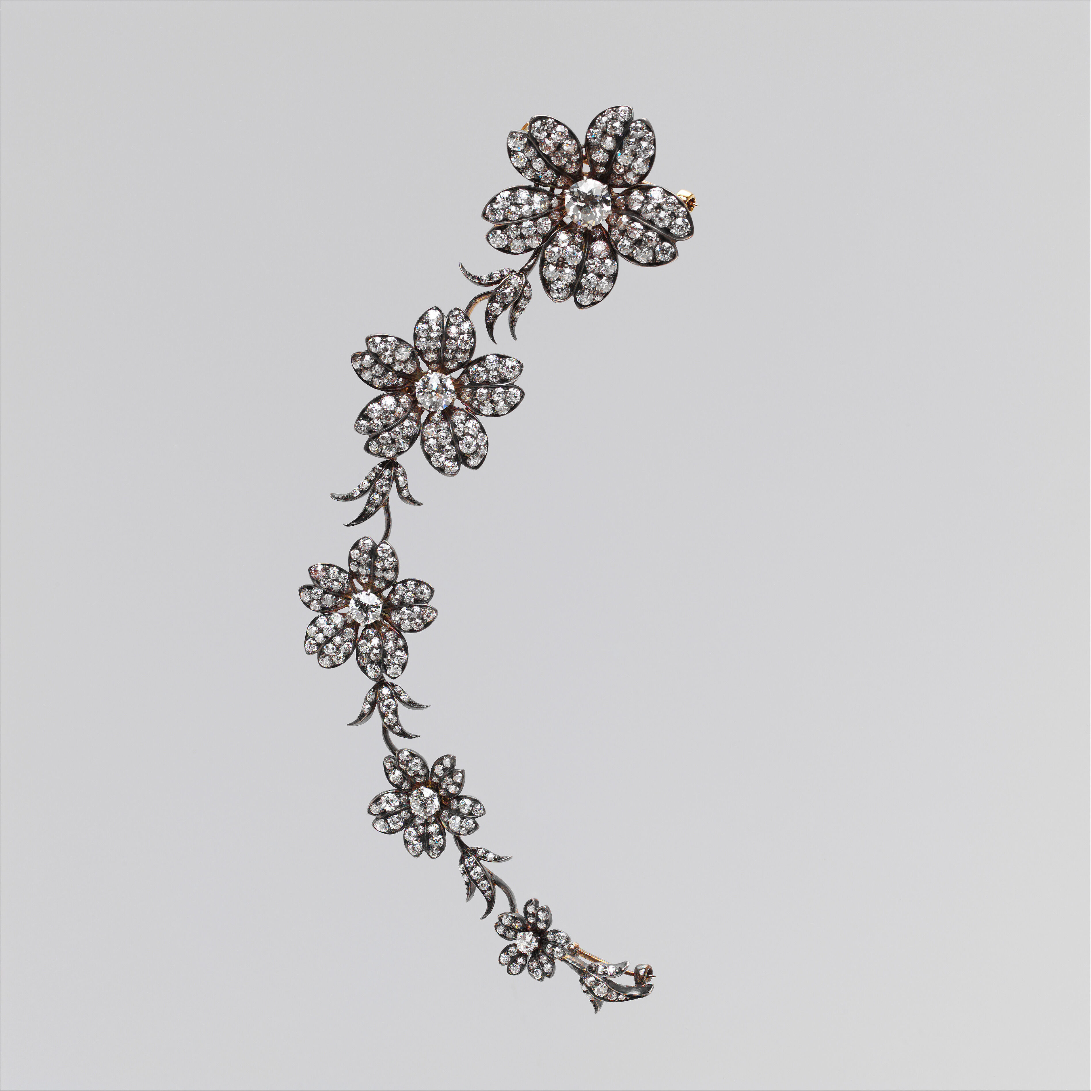 Diamonds had become so fashionable by the last quarter of the nineteenth century that their presence in American society was being noted in the daily press. On April 7, 1889, the New York Sun announced "Diamonds flash from the buttons of a baby's layette, gleam on the dimpled hands of the tiniest child, sparkle on the young girl's fingers, and blaze from the neck and ears and wrists of the society belle…." With the discovery in 1869 of rich diamond fields in South Africa, Americans gained a new and more abundant source for the sparkling gems, which had previously come from India or Brazil. Coinciding with greater availability was the invention of new faceting techniques that sped production as well as enhancing the stone's brilliance. Circular collet settings with foil and metal backings were replaced by more open settings that allowed light to shine through. A particularly American fashion was the corsage piece, a garland of diamonds that was worn on the bodice or waist of a dress. The present example, set with 305 diamonds, was made as a flexible cascade of flowers graduated in size. Its owner, Susan Dwight Bliss (d. 1966), donated a handsome collection of diamond jewelry to the Metropolitan Museum in the 1940s and '50s.