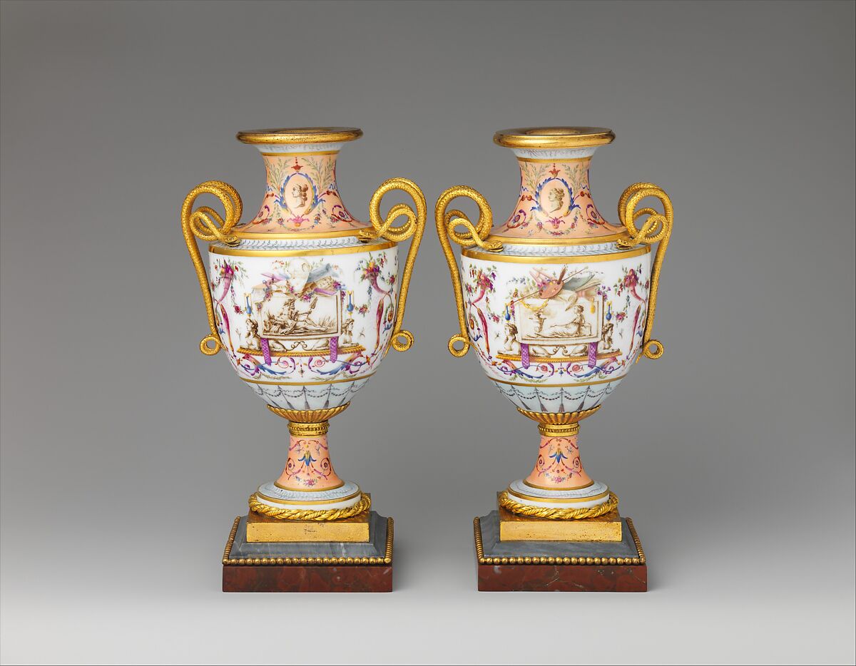 Made in 1789, on the eve of the French Revolution, this pair of vases reflects the superb quality and luxuriousness achieved by the Royal Porcelain Manufactory at Sèvres at the peak of its production. The vases were made to be purely decorative, and their diminutive scale was especially well suited to the intimate interiors that were in vogue in late eighteenthcentury France. They are painted with delicate scrolls that incorporate vegetal motifs, cornucopias, and birds’ heads. This type of decoration, known as the arabesque style, was very much in fashion in the 1780s not only throughout the decorative arts but also in interior decoration. On these vases the scrolling motifs surround panels painted to resemble prints depicting a male river god and a woman in classical dress. The richness of the decoration is enhanced by the two colors of marble employed for the base and by the finely worked coiling snakes that form the handles.