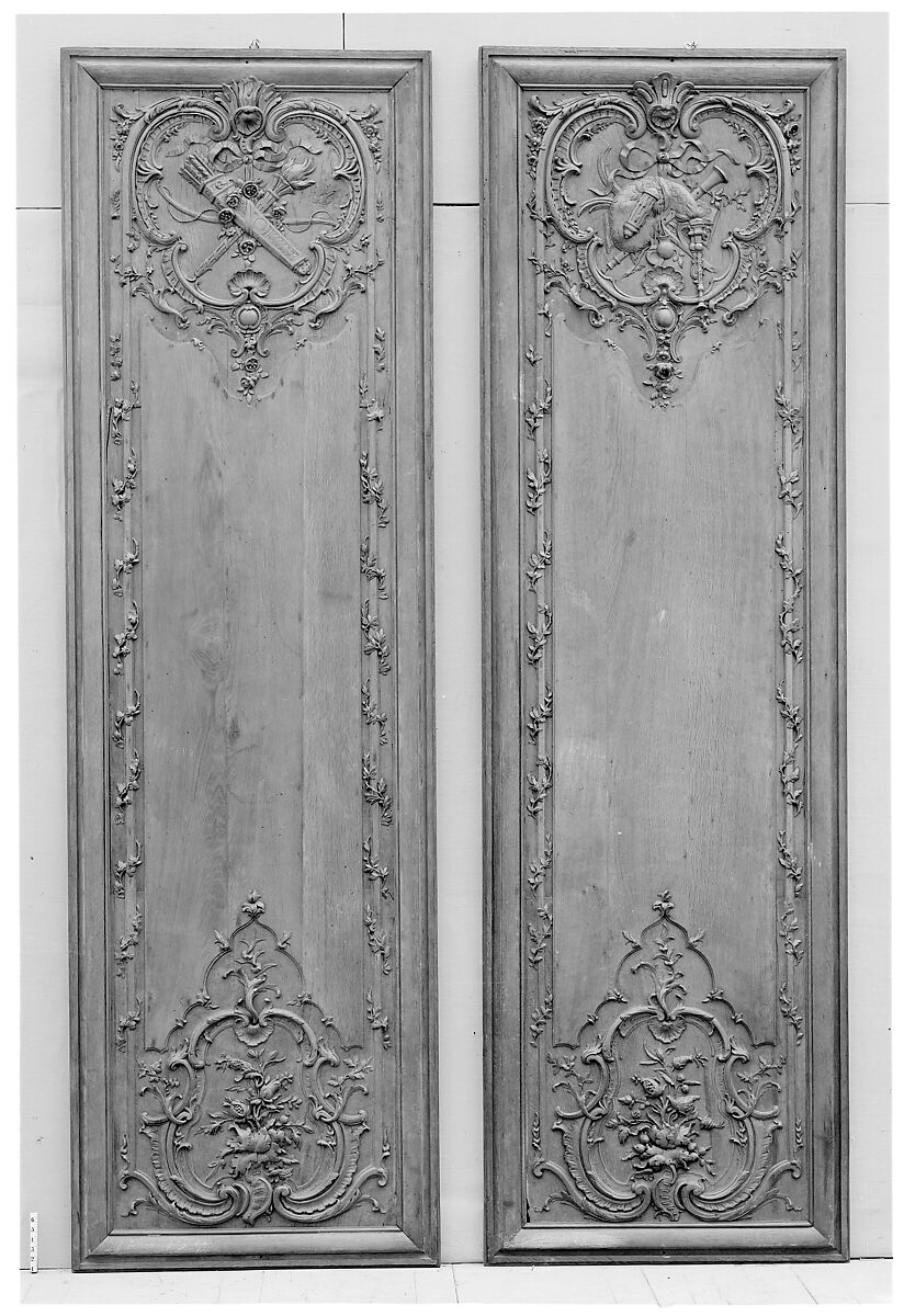 This pair of panels is believed to have come from a private residence in the Marais, Paris. Although the provenance cannot be substantiated, one of the panels is carved with a trophy of love symbols (a quiver with arrows, cupid’s bow, a flaming torch and roses) in a shaped cartouche composed of C-scrolls at the top (07.225.154a). A trophy of musical instruments consisting of a bagpipe (musette du cour), oboe (hautbois), a pair of castanets, and a book of music decorates the other (07.225.154b). A second similarly shaped cartouche with floral ornament embellishes the lower part of both panels while sprigs of ivy and olive branches winding around an upright molding decorate the sides. Originally part of a larger ensemble and stripped of its surface paint and possibly gilded details, the panels were later framed as individual works.