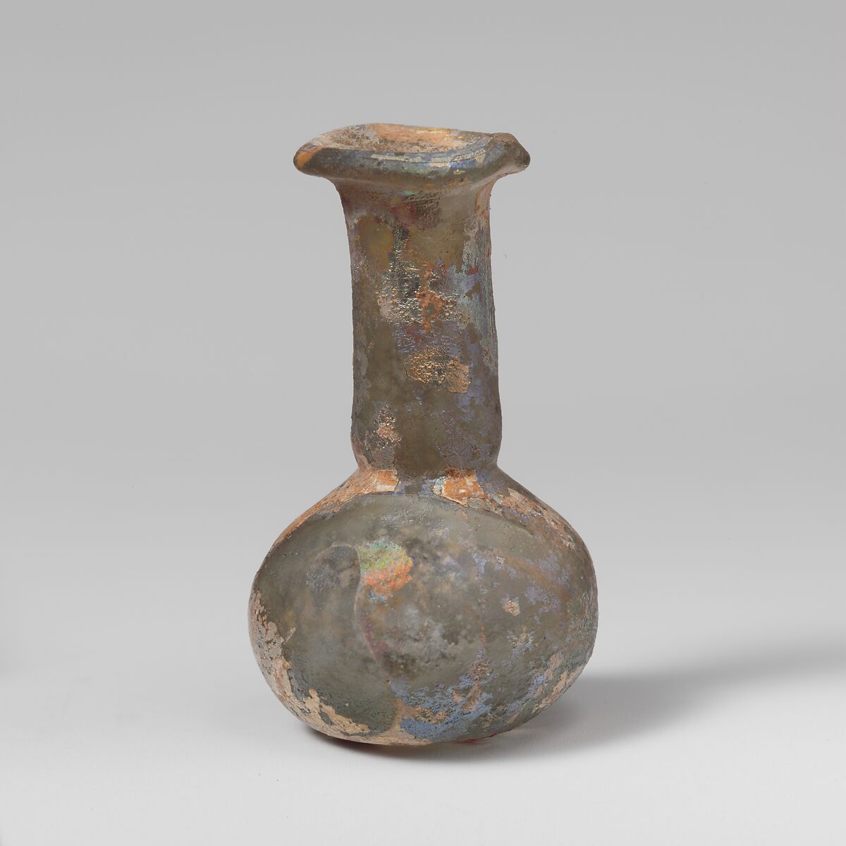 Thickened, rounded, uneven rim; flaring mouth; cylindrical neck, tooled in around base; squat bulbous body; small, flattened bottom.