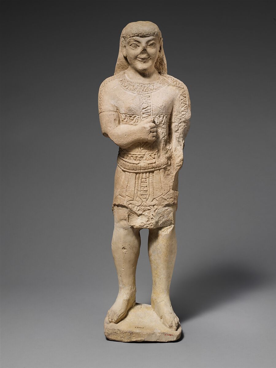 - Title: Limestone statuette of a beardless male votary in Egyptianizing dress