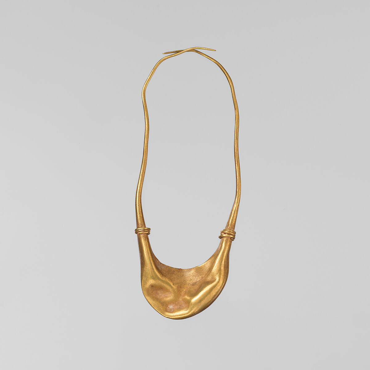 Most of the raw materials for Cypriot jewelry came from the East. Gold became plentiful in the Late Bronze Age, when Syria and Egypt were the primary sources. Types of jewerly include the boat-shaped earring, inspired by Near Eastern imports and types of Cypriot creation, such as the ornaments in the form of bulls' heads.