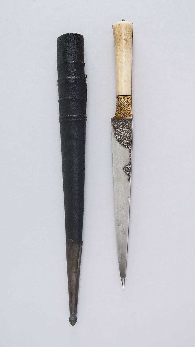A kard is defined as a straight, single-edged dagger that is worn on the left side of the belt. Unlike most daggers, in which the narrow tang attached to the blade fits into a handle, the blades of these daggers are made with a flat steel tang of the same width as the blade. Two ivory pieces were fitted into and riveted to either side of the tang to form the handle. This example resembles a number of early nineteenth-century Iranian kards that have ivory hilts and watered steel blades with floral arabesque ornamentation. The hilt of this particular dagger has also been decorated with metal bands bearing a gold vegetal design. This example is so similar to one signed by the maker, Muhammad Nami, and dated 1799/1800 (located in Bern), that both can be assumed to come from the same workshop.