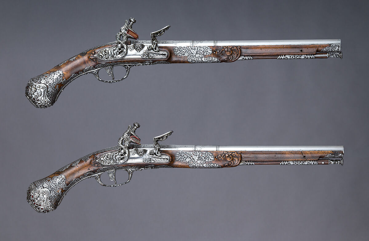 The pistols are inscribed in Latin Viena Liberata (Vienna liberated) and Buda Superata (Buda captured) in commemoration of the two major events, in 1683 and 1686, in the war between Austria and Turkey.