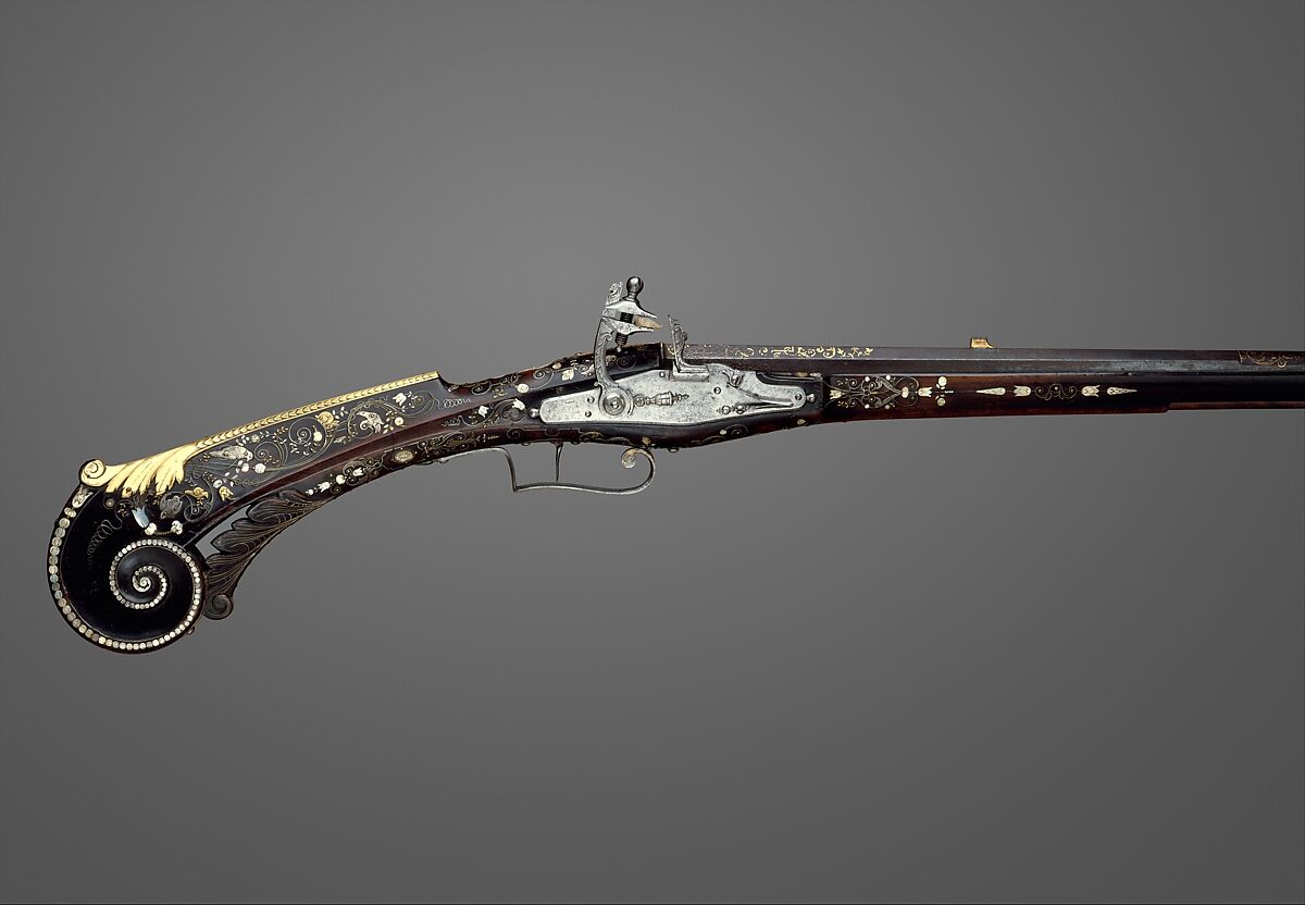 이 총은 초기 총의 역사에서 가장 오래된 화승총 중 하나로 이후 2백여 년간, 소형화기 기술에서 가장 돋보인 격발장치를 장착한 화승총입니다. 화승총을 발명했다고 일컬어지는 리지외의 피에르와 마랭 르 부르주아가 루이 13세를 위해 만들었습니다. 왕관 모노그램이 있는 이 총은 섬세한 와이어와 자개 세공, 아름답게 조각된 개머리판, 도금된 황동 부품 등으로 호화롭게 장식되었습니다. 루이 13세는 열렬한 권총 수집가였으며 아마추어 권총제작자이기도 하였습니다. 이 총은 제조번호인 134가 새겨져 있어 왕실의 컬렉션 또는 수집가의 전시실 작품 중 하나라고 추정됩니다.