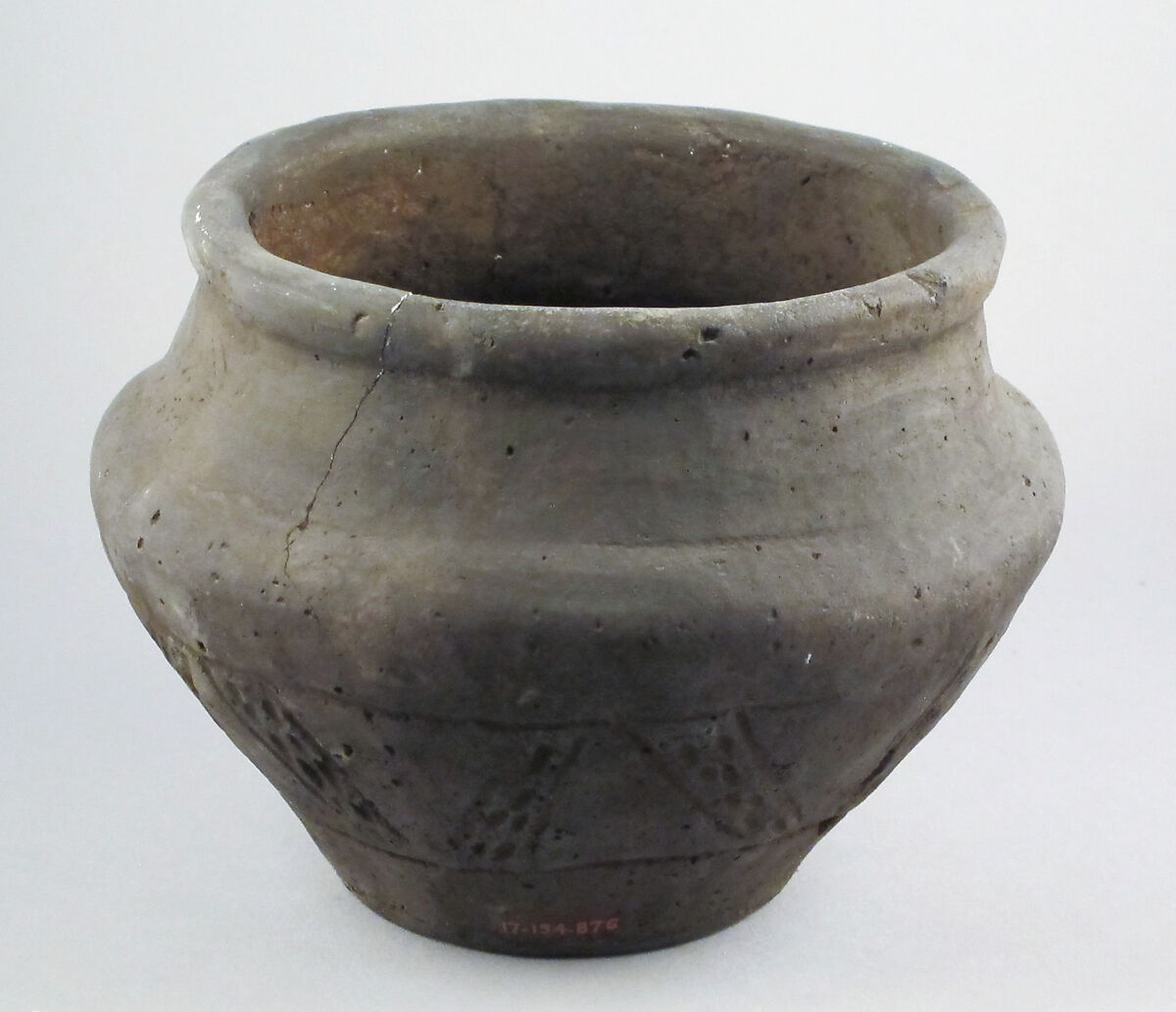 Black bowl with stamped zigzag around body; hand-made; unglazed.