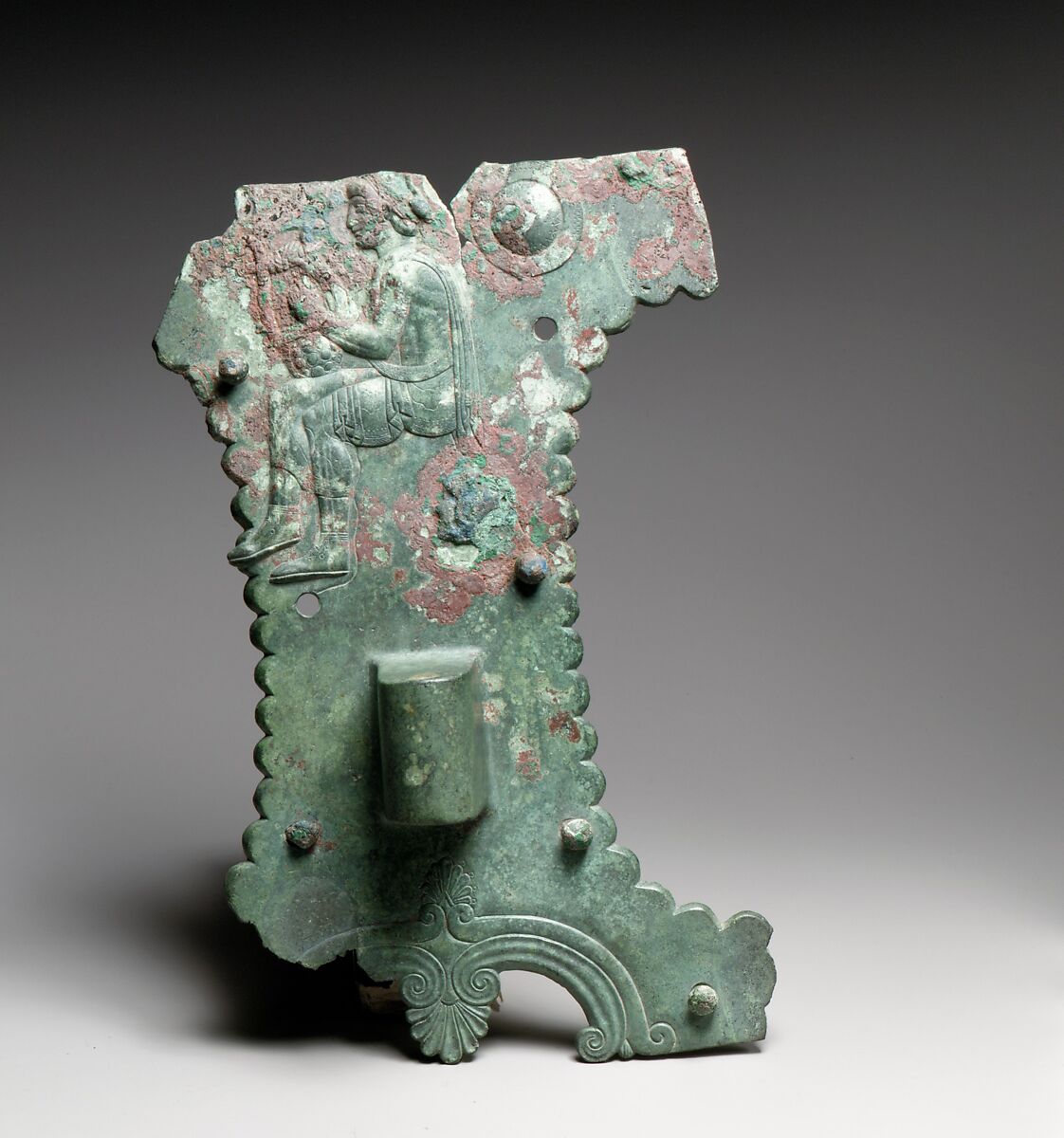 This large collection of bronze fittings, many with their iron or bronze nails still preserved, once belonged to a wheeled wooden cart or chariot. Because all the larger elements have a flat back, we can assume that they came from a vehicle that was basically rectilinear rather than curved like the Monteleone Chariot displayed in this gallery. In a number of instances, the same Etruscan tomb contained both a chariot and a light cart that perhaps served as a hearse to carry the deceased to the cemetery. The precise function of the vehicle represented here is uncertain.