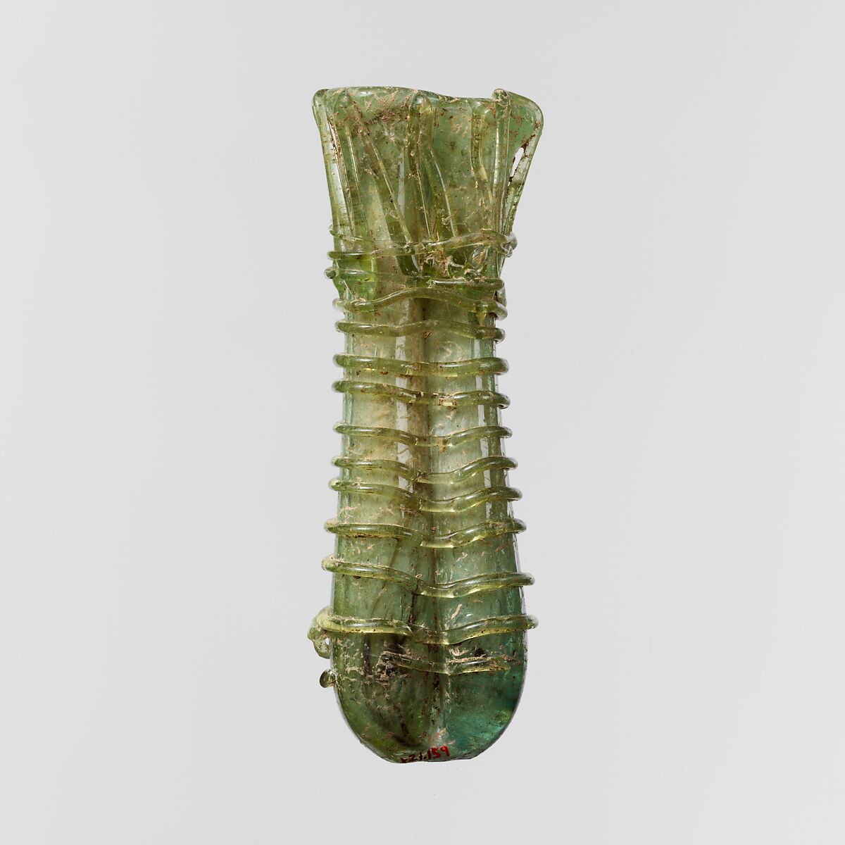 Thick, everted rim, folded over and in; body comprising two tubes, side by side, made from a single inflated gather by pinching sides vertically to make diaphragm; small, uneven bottom with trace of pontil mark.