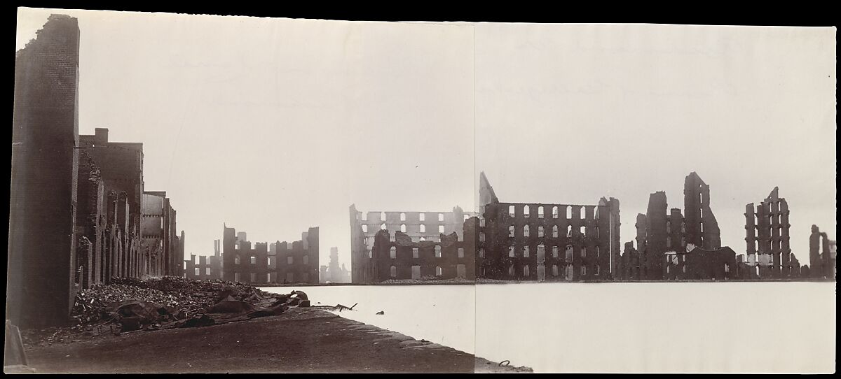 In 1861, at the outset of the Civil War, the Confederate government moved its capital from Montgomery, Alabama, to Richmond, Virginia, to be closer to the front and to protect Richmond’s ironworks and flour mills. On April 2, 1865, as the Union army advanced on Richmond, General Robert E. Lee gave the orders to evacuate the city. A massive fire broke out the following day, the result of a Confederate attempt to destroy anything that could be of use to the invading Union army. In addition to consuming twenty square blocks, including nearly every building in Richmond’s commercial district, it destroyed the massive Gallego Flour Mills, situated on the James River and seen here. Alexander Gardner, Mathew B. Brady’s former gallery manager, then his rival, made numerous photographs of the "Burnt District" as well as this dramatic panorama from two glass negatives. The charred remains have become over time an iconic image of the fall of the Confederacy and the utter devastation of war.