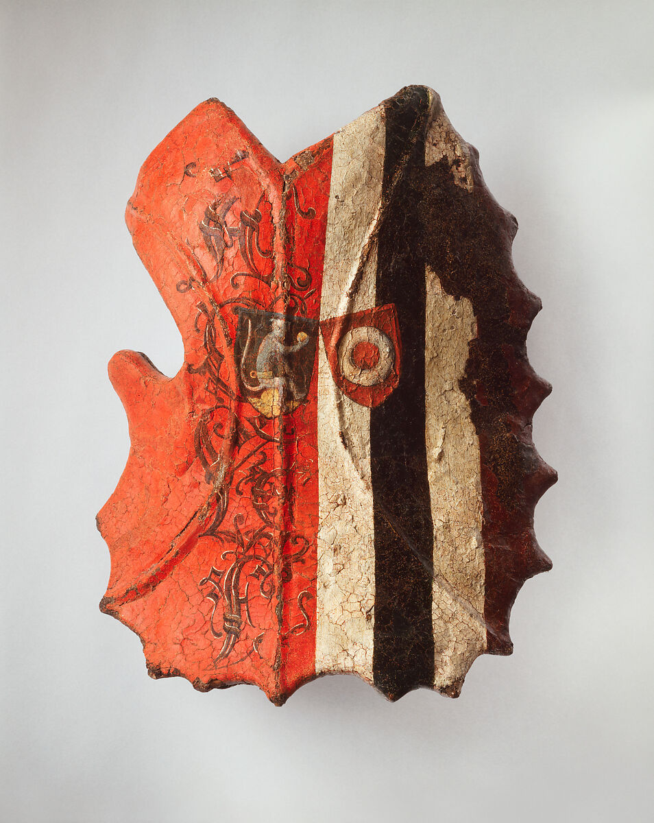 This unusual sturdy shield is distinctive for its convex profile, the raised ribs on its surface, and its decorative scalloped edges. Recently conserved, the brilliantly colored surface displays two campaigns of painting. The earlier decoration shows a vertically divided design: the dexter (shield’s right) side is painted red with vertically aligned letters AGVF, probably those of the shield’s owner, and the sinister (shield’s left) side has colored stripes. Painted over this design are two small shields with the arms of two Nuremberg patrician families, Ketzel (on a black ground, a silver monkey holding a gold ball) and Koler (on a red ground, a silver ring). These arms refer to Lucas Ketzel and Magdalena Koler, who married in 1467. The arms may have been added to the shield after Lucas’s death in 1485, when the shield would have been hung in a church or chapel as a memorial. Beneath the top two layers of painting is an earlier layer with different designs, evidence that this shield had a long working life.